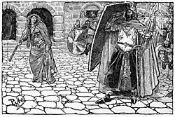 Десять дней продолжались пиры и рыцарские игры; на одиннадцатый обе королевы сидели вместе, и Кримхильда начала восхвалять Зигфрида. «Он всё-таки только вассал Гунтера, — отвечала Брюнхильда; — он сам сказал это, когда твой брат сватался за меня». Кримхильда просит её оставить такие оскорбительные речи: разве братья выдали бы её за вассала? Ссора разгорается; Кримхильда в негодовании восклицает, что докажет ей в тот же день, что она не жена вассала, а такая же королева, и войдёт первой в церковь.