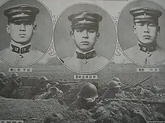 22 февраля японская армия наступала на китайские укрепления к северу от Шанхая в местечке Мяоханчжэнь (в настоящее время территория шанхайского района Баошань). Китайские заграждения из колючей проволоки представляли серьёзную преграду для японской пехоты. В 5:30 утра рядовые 1-го класса Такэдзи Эсита, Сусуму Китагава и Иносукэ Сакуэ, служившие в сапёрном батальоне, были отправлены на подрыв проволочных укреплений. Они несли с собой бангалорскую торпеду — трёхметровую бамбуковую трубку, начинённую взрывчаткой. Они побежали на китайские укрепления с подожжённым заранее запальным шнуром торпеды, понимая, что им не хватит времени его поджечь, если они поднесут торпеду поближе к заграждению. Все трое взорвались вместе с торпедой и погибли, при этом была пробита брешь в китайских укреплениях. 24 февраля известие о трёх сапёрах оказалось на первых страницах газет. Пресса на все лады восхваляла героев: их подвиг, как писали газеты, превосходил подвиги капитана Хиросэ и подполковника Татибаны. В «канонизации» сапёров принимал участие лично министр армии Садао Араки[1].