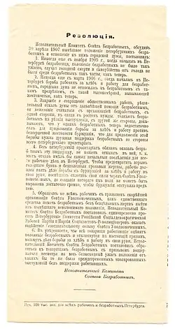 В апреле 1906 г. Совет безработных обратился в городскую думу Петербурга с петицией о помощи безработным и внес конкретные предложения об организации общественных работ в столице, рассчитанных на использование в течение полугода 6 тыс. человек. Городская дума ассигновала 500 тыс. руб. на продовольственную помощь и квартирные пособия безработным и затем выделила 2,5 млн руб. на организацию общественных работ (ремонт мостов, строительство рынков, реконструкция Галерной гавани). Совет безработных открыл столовые, выдававшие в пик своей деятельности ежедневно от 16 до 20 тыс. бесплатных обедов. На общественных работах были введены 8-часовой рабочий день, поденная оплата труда, избраны особые уполномоченные с правом контроля за ходом работ. Однако к концу 1906 г. общественные работы стали свертываться, власти начали высылать безработных из столицы, разгоняли их собрания, закрывали столовые, подвергали аресту активистов этого движения. В конце 1907 г. все члены Совета безработных были арестованы[28].