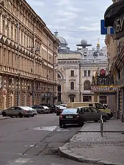 - № 1/20/21 — Доходный дом с квартирами и магазинами (1876, архитектор Б. В. Фрейденберг, инженер К. И. Шестаков). Здесь в 1878—1883 годах жили учёные С. В. Ковалевская и В. О. Ковалевский, в 1899—1903 годах размещалась редакция газеты «Курьер», в которой работали писатели Л. Н. Андреев, В. В. Вересаев, Н. Д. Телешов и другие. До 1917 года в доме работал книжный магазин и издательство И. Н. Кнебеля. Выявленный объект культурного наследия[2].