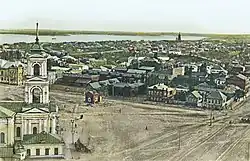 Вид с пожарной каланчи. Длинное здание на второй линии от площади — склады