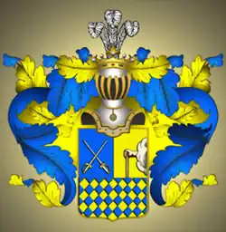 Щит разделен горизонтально на две части; из коих нижняя часть имеет шахматное изображение из золота и голубого цвета; в верхней части разрезанной на двое в правом голубом поле положены крестообразно две Шпаги, а в левом золотом поле видна выходящая Рука, которая держит трость.