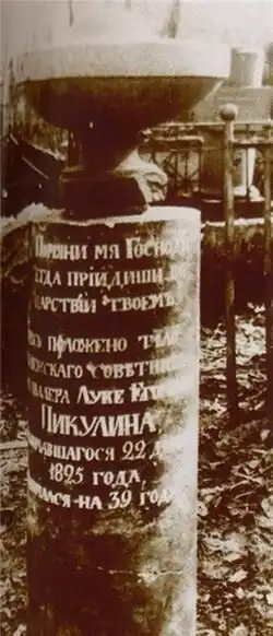 - ↑ Памятник на его могиле содержал надпись: «здесь положено тело коллежского советника и кавалера Луке[sic] Егоровича Пикулина, скончавшегося 22 декабря 1825 года <…?> на 39 году».