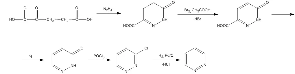 Пиридазин синтезируют реакцией гидразина с α-кетоглутаровой кислотой по следующей схеме: