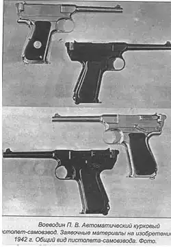 Пистолет Воеводина существовал в нескольких вариантах и выпускался малыми сериями в конце 1930-х — начале 1940-х годов но в виду начала Великой Отечественной войны и нетехнологичности производства в массовый выпуск не пошел. Действовал по принципу жесткого запирания ствола при его коротком ходе. Имел двухрядный магазин на 18 патронов. Отдельно стоит отметить характерный внешний вид пистолета, который был обусловлен требованиями техзадания: по условиям конкурса ствол пистолета должен был пролезать в смотровые щели бронемашин и танков, чтобы отстреливаться от пехоты противника. В целом, конструкция пистолета несколько напоминает пистолет Люгера Р-08 (общая форма) и Маузер С-96 (устройство узла запирания и затвора). Схожие инженерные решения были использованы конструкторами таких известных пистолетов межвоенного периода, как финский Лахти Л-35 или японский Намбу Тип 14.
