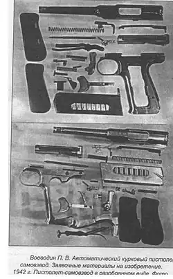 ![]() Пистолет Воеводина, изготовленный в 1942 году в Ижевске на заводе № 622 НКВ в качестве подарка И.В. Сталину[2] | |