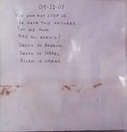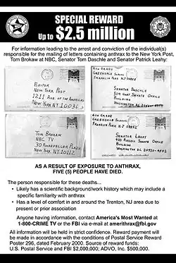 Письма со спорами сибирской язвы, также известны как Amerithrax (America и anthrax), — акт биотерроризма, заключающийся в отправке писем, содержащих в себе споры сибиреязвенной палочки по почте в несколько офисов СМИ и двум сенаторам от Демократической партии США в течение нескольких недель, начиная с 18 сентября 2001 года, через неделю после терактов 11 сентября. Заразилось 22 человека, из них пять человек погибли. Дело расследовало ФБР. По утверждению ФБР, это расследование стало «одним из крупнейших и наиболее сложных в истории правоохранительных органов»[1].