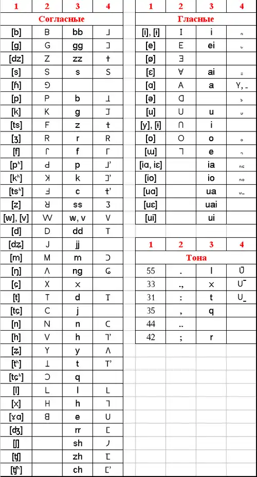 Тона обозначаются буквами l — высокий ровный, q — средний восходящий, x — средний ровный, r — средний нисходящий, t — низкий нисходящий. Средне-высокий ровный тон на письме не обозначается.