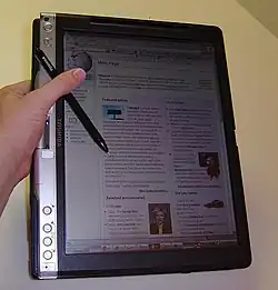Планшетный персональный компьютер — разновидность ноутбуков, оформившаяся после презентации аппаратно-программной платформы Microsoft Tablet PC в ноябре 2002 года. Оборудованы сенсорным экраном и позволяют работать при помощи стилуса или пальцев как с использованием, так и без использования клавиатуры и мыши.