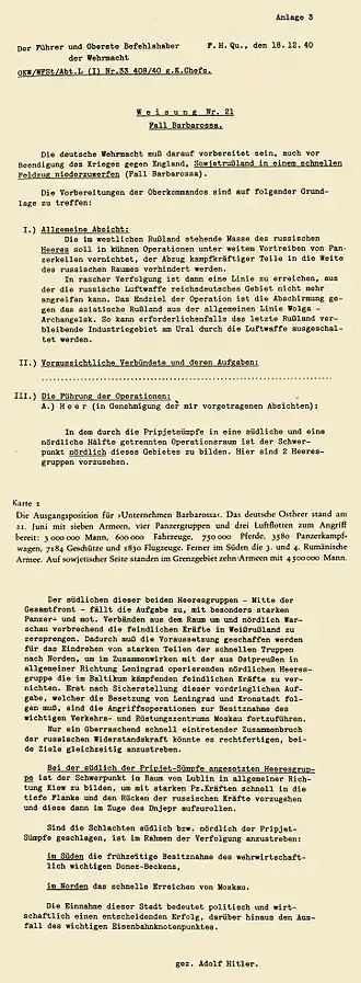 18 декабря 1940 года после внесения некоторых уточнений в проект Гитлер подписал директиву № 21 верховного главнокомандования вермахта, получившую условное наименование «Вариант Барбаросса» и ставшую основным руководящим документом в войне против СССР[13]. Именно в этот день план агрессии против СССР впервые получил название «Вариант Барбаросса»[13]. Вооружённым силам Германии ставилась задача «разгромить Советскую Россию в ходе одной кратковременной кампании», для чего предполагалось использовать все сухопутные войска за исключением тех, которые выполняли оккупационные функции в Европе, а также примерно две трети ВВС и небольшую часть ВМС. Стремительными операциями с глубоким и быстрым продвижением танковых клиньев германская армия должна была уничтожить находившиеся в западной части СССР основные силы советских войск и не допустить отхода боеспособных частей вглубь страны. В дальнейшем, быстро преследуя противника, немецкие войска должны были достичь линии, откуда советская авиация была бы не в состоянии совершать налеты на Третий рейх. Конечная цель кампании — выйти на линию Архангельск — Волга — Астрахань, создав там, в случае надобности, условия немецким ВВС для «воздействия на советские промышленные центры на Урале»[9].