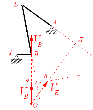 - Направление скорости точки В легко определяется — эта скорость перпендикулярна отрезку ГВ, так как звено ГВ вращается вокруг точки Г.