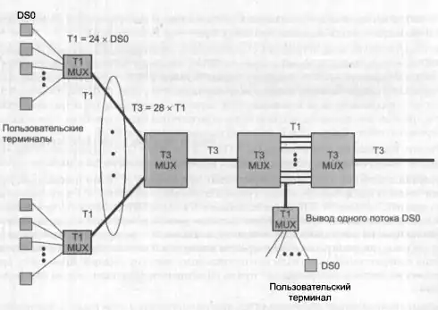 Как американский, так и международный варианты технологии ПЦИ обладают недостатками, основным из которых является сложность и неэффективность операций мультиплексирования и демультиплексирования пользовательских данных. Применение техники бит-стаффинга для выравнивания скоростей потоков приводит к тому, что для извлечения пользовательских данных из объединенного канала необходимо полностью демультиплексировать кадры объединенного канала. Например, чтобы получить данные одного абонентского канала 64 Кбит/с из кадров канала Т-3, требуется произвести демультиплексирование этих кадров до уровня кадров Т-2, затем - до уровня кадров Т-1, а в конце концов демультиплексировать и сами кадры Т-1. Если сеть ПЦИ используется только в качестве транзитной магистрали между двумя крупными узлами, то операции мультиплексирования и демультиплексирования выполняются исключительно в конечных узлах, и проблем не возникает. Но если необходимо выделить один или несколько абонентских каналов в промежуточном узле сети ПЦИ , то эта задача простого решения не имеет. Как вариант предлагается установка двух мультиплексоров уровня ТЗ/ЕЗ и выше в каждом узле сети. Первый призван обеспечить полное демультиплексирование потока и отвод части низкоскоростных каналов абонентам, второй — опять собрать в выходной высокоскоростной поток оставшиеся каналы вместе с вновь вводимыми. При этом количество работающего оборудования удваивается.