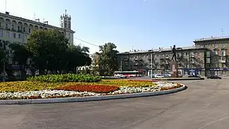 С момента образования площади в её центре находится большая круглая клумба. В первые годы в центре клумбы в начале 1950-х годов располагался памятник безымянному архитектору — строителю города, не сохранившийся до наших дней. Зимой на клумбе устанавливалась новогодняя ёлка[4][1].