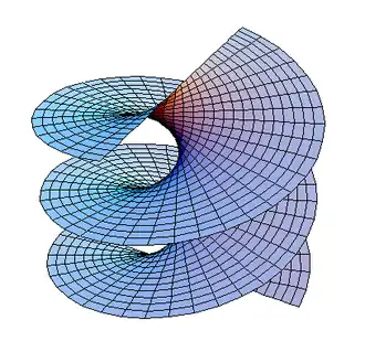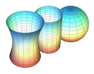 • Поверхность вращения с имеет постоянную гауссову кривизну −1. Частный случай получается путём принятия , и [14][16][17]. Последний случай является классической псевдосферой, образованной вращением трактрисы вокруг центральной оси. В 1868 году Эудженио Бельтрами показал, что геометрия псеводосферы была напрямую связана с геометрией гиперболической плоскости, открытой независимо Лобачевским (1830) и Бойяи (1832). Уже в 1840 году Ф. Майндинг, студент Гаусса, получил тригонометрические формулы для псевдосферы, идентичные формулам для гиперболической плоскости[18]. Эта поверхность постоянной кривизны ныне лучше понимается в терминах метрики Пуанкаре на верхней полуплоскости или единичном круге и может быть описана другими моделями, такими как модель Кляйна или гиперболоидная модель, полученная рассмотрением двулистного гиперболоида в трёхмерном пространстве Минковского, где [19].