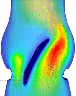 Для митральной позиции зависимость гидродинамики потока в левом желудочке от ориентации протеза была изучена в лаборатории полимеров ИССХ им. А. Н. Бакулева АМН СССР. Исследование показало, что в диастолу поток имеет циркулярный характер с вихревыми зонами в центре желудочка, позади диска и в области культей мышц. К началу систолы происходит переориентация линий тока к выводному тракту левого желудочка, что сопряжено с образованием очагов завихрения и потерей энергии. Единственной ориентацией дисковых протезов, при которой поток попадает в выводной тракт левого желудочка не меняя направления, является такая, когда диск открывается в сторону задненаружной стенки желудочка, расположенной напротив выводного тракта[57]. Однако на практике, если не удаётся выбрать оптимальную ориентацию протеза в силу анатомических особенностей, хирург имплантирует его таким образом, чтобы обеспечить беспрепятственное движение запирающего элемента[58]. С учётом особенностей гидродинамики при протезировании аортального клапана его большее полуотверстие должно быть ориентировано в сторону некоронарной створки.