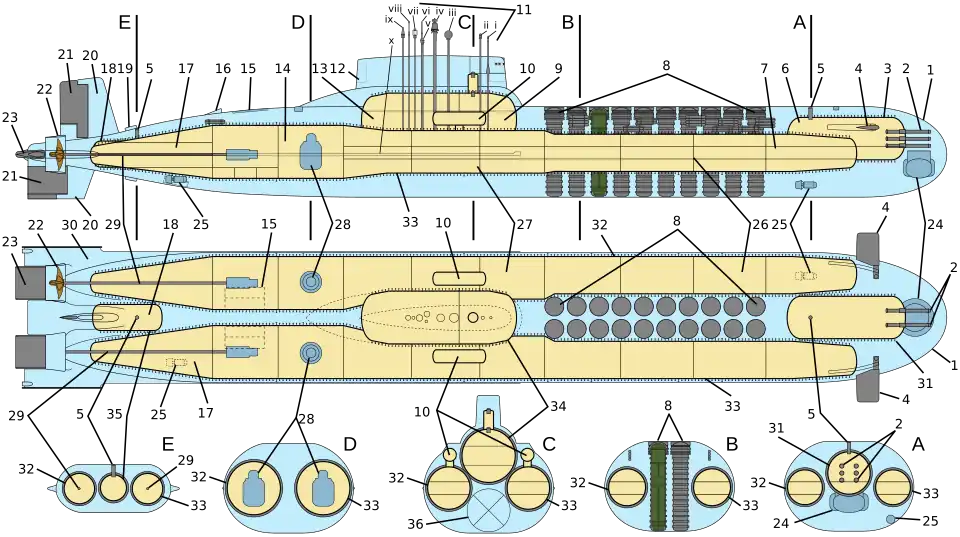 Особенностью конструкции лодки является наличие внутри лёгкого корпуса пяти обитаемых прочных корпусов. Два из них являются основными, имеют максимальный диаметр 10 метров и расположены параллельно друг другу, по принципу катамарана. В передней части корабля, между главными прочными корпусами, расположены ракетные шахты, которые впервые были размещены впереди рубки[23]. Каждый из главных корпусов разделён на 8 отсеков, также имеются три отдельных герметичных отсека: торпедный, модуль управления с центральным постом и кормовой механический. Вынос и размещение трёх отсеков в пространство между основными корпусами позволило повысить пожаробезопасность и живучесть лодки[24]. По мнению генерального конструктора С. Н. Ковалёва