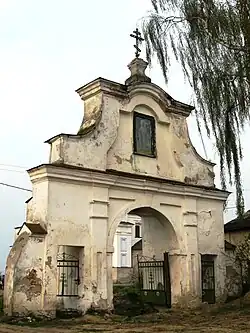 От старой ограды остались кирпичные оштукатуренные ворота в виде трехпролетной арки, завершенной криволинейным барочным фронтоном.