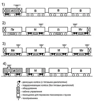 Некоторые вагоны моторвагонных составов оборудуются кабинами управления; они называются головными, потому что могут ставиться впереди. Но так как кабина отнимает полезное пространство внутри кузова, то на промежуточных вагонах её часто не ставят, хотя эти вагоны в результате не могут работать отдельно. Схема компоновки прицепных и моторных вагонов в моторвагонном составе различна, а головными вагонами могут быть как прицепные, так и моторные. Прицепные вагоны дешевле моторных, но зато увеличение их числа по отношении к моторным снижает ускорение при пуске, что особенно актуально для таких видов транспорта, как метрополитен, с его большим числом остановок. В этих случаях состав состоит только из моторных вагонов[34][36][37].