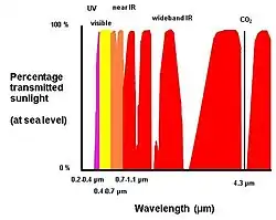Солнце излучает в большом объёме. Значительная часть излучения задерживается атмосферой. На рисунке хорошо видна «холодная» зона в области поглощения СО2. Использование для обнаружения пламени таких зон позволяет создавать извещатели, у которых будут отсутствовать ложные срабатывания от солнечного света.