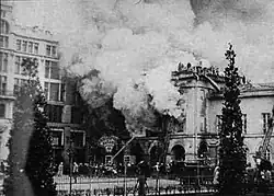 Самый крупный московский пожар столетия начался в ночь со 2 (14) на 3 (15) сентября 1812 года, после вступления в город войск Наполеона. Сильное возгорание длилось около недели и окончательно утихло лишь к 6 (18) сентября. По свидетельствам очевидцев, «в покинутой жителями Москве очаги пламени, раздуваемые ураганным ветром, слились в один огромный костер». По распространённой версии, приказ поджигать покинутый город отдал московский генерал-губернатор, граф Фёдор Ростопчин[235]. Однако большой урон городу нанесли оккупанты, на Тверской сохранилось лишь 12 домов, а в Китай-городе — два, в пожаре погибли Императорский университет с библиотекой и архивами. Были утрачены многие памятники культуры: считается, что в то время сгорел единственный экземпляр «Слова о полку Игореве» из коллекции Алексея Мусина-Пушкина[236]. При отходе французские войска заминировали Грановитую палату, Арсенал, колокольню Ивана Великого, башни и стены Кремля. Несколько башен с пряслами, часть Арсенала и две пристройки к колокольне были взорваны. Среди уцелевших исторических зданий — Английский двор XV века в Зарядье, самое старое «многоэтажное здание» древней столицы — сушило Симонова монастыря, а также дом Фёдора Растопчина[237]. В результате отступления, по подсчётам историков, сгорело две трети построек: из 2567 каменных домов сгорело около двухсот, а из 6591 деревянных уцелело порядка 250. Кроме того, в огне пострадали 122 храма, 8251 складское и торговое помещение. Общий ущерб от городских разрушений был оценён в 320 миллионов рублей[238][239]. По масштабам реконструкции этот проект сравнивают с возведением Петербурга в XVIII веке[208].