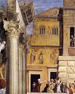 В правой части композиции изображена группа женщин, приносящих кувшины с водой, чтобы потушить пламя в храме с колоннами ионического ордера, напоминающего храм Сатурна на римском Форуме.