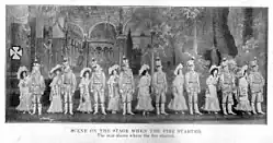 В это время исполнитель одной из главных ролей актёр-комик Эдди Фой, который готовился к выступлению, убедившись, что его маленький сын находится под опекой рабочего сцены[5], выбежал на сцену и призывал зрителей не поддаваться панике, несмотря на то, что с потолка на сцену уже валились огромные горящие куски декораций[3]. При этом оркестру он приказал играть весёлую музыку. Сперва зрители даже не подозревали об опасности и даже аплодировали, смотря на горящую сцену. Но затем над сценой от жара взорвались 2 баллона с ацетиленом. Взрывы и падающие куски декораций разрушили систему электроснабжения здания, и во всём театре разом погас свет. Из-за этого внезапно началась сильная паника, и все зрители разом стали пытаться выбраться из горящего здания.