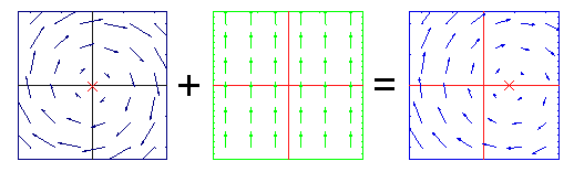 • Иллюстрация сложения полей Киллинга на плоскости. Поле вращений вокруг начала координат + поле параллельного переноса вдоль оси y = поле вращений вокруг центра, смещённого относительно начала координат вдоль оси x: