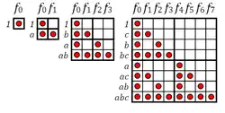 Существует закономерность, которая позволяет получить таблицу для функции N переменных, имея таблицу для функции N − 1 переменных. Новая таблица TN+1 компонуется как матрица 2 × 2 таблиц TN, причём правый верхний блок матрицы очищается.