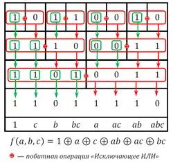 - Если в верхней строке какого-либо столбца стоит единица, то соответствующий член присутствует в полиноме Жегалкина.
