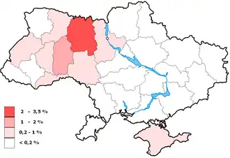Ныне поляки в национальном составе населения Украины составляют 0,3 % и представлены практически во всех её регионах, но традиционной полосой их расселения остаются западные районы Украины: Житомирщина (4,5 %), Хмельнитчина (2,4 %), Львовщина (1 %), Тернопольщина (0,6 %)[2], Волынь (0,5 %). По сравнению с переписью 1989 года количество польского населения сократилось на 34 %.