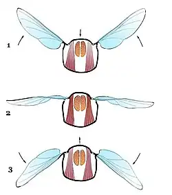 Крылья насекомых, в отличие от крыльев летающих позвоночных животных, лишены собственной мускулатуры и приводятся в движение сокращением мышц груди.