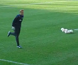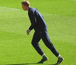 Март Поом разминается перед матчем сборных Эстонии и Англии
