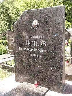 Генерал-майор Александр Ипполитович Попов 5 июля 1958 года вышел в запас. Умер 11 августа 1979 года в Киеве. Похоронен на Лукьяновском военном кладбище.