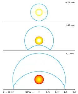 Максимальная температура поверхности светящейся области составляет обычно 5700-7700 °C. Когда температура снижается до 1700 °C, свечение прекращается. Световой импульс продолжается от долей секунды до нескольких десятков секунд, в зависимости от мощности и условий взрыва. Приближенно, продолжительность свечения в секундах равна корню третьей степени из мощности взрыва в килотоннах. При этом интенсивность излучения может превышать 1000 Вт/см² (для сравнения — максимальная интенсивность солнечного света 0,14 Вт/см²).