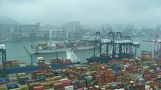 В начале 1970-х годов порт Гонконга начал развивать контейнерный сектор, что потребовало существенного расширения портовых площадей и значительных дноуглубительных работ в районе Кхуайчхун (во время насыпных работ в 1970—1990-х годах три небольших островка были слиты с полуостровом Коулун). Вокруг нового контейнерного терминала сформировалась современная индустрия логистики, включавшая портовые складские помещения, упаковку и доставку товаров. Однако нефтяной кризис 1973 года привёл к биржевому краху и сокращению судоходства, что негативно повлияло на работу порта Гонконга[3][59][60][61].