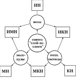 Послойный (Layer-by-Layer) синтез наноматериалов - синтез, основанный на последовательных и многократных реакциях адсорбции из газовой фазы или растворов на поверхности подложки-матрицы молекул или ионов, а также адагуляции из растворов коллоидных частиц. Данные реакции характеризуются так называемым “насыщением”, т.е. образованием в результате адсорбции одного монослоя (или при сверхэквивалентной адсорбции полислоя) структурных единиц адсорбирующегося вещества. В процессе синтеза последовательности обработок выбирают такими, чтобы образовавшийся слой являлся новой подложкой при адсорбции следующего реагента и в результате достигаются условия циклического роста толщины слоя, причём толщина суммарного слоя контролируется числом последовательных циклов наслаивания. Среди методов послойного синтеза с учетом природы реагентов, которые участвуют в реакциях образования слоев при их взаимодействии с подложкой, можно выделить методы молекулярного (МН), ионного (ИН), ионно-молекулярного (ИМН), ионно-коллоидного (ИКН), молекулярно-коллоидного (МКН) и коллоидного (КН) наслаиваний.