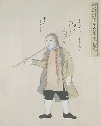 17 июля Лаксман встретился с японскими чиновниками в усадьбе Хамаясики: он рассказал о поручении Ивана Пиля направиться в Эдо с целью передать японскому правительству письмо, возвратить потерпевших кораблекрушение и договориться о российско-японском сотрудничестве[65]. Представитель губернатора, в свою очередь, зачитал постановление о возвращении Лаксману его ранее переданного письма из-за незнания русского языка и непонимания прилагавшегося перевода, написанного, по словам чиновника, «азбукой, похожей на японскую кана», но непонятного «из-за большого количества помарок» и труднораспознаваемых иероглифов: «поэтому во избежание всяких недоразумений отвечать… очень затруднительно»; не был принят и исправленный перевод. Чиновник из Эдо передал Лаксману сообщение правительства сёгуната о строгом запрете сношений иностранных государств за исключением Голландии с Японией, однако поскольку россияне не знали этого и проделали сложный путь, им в порядке исключения позволялось возвратить Кодаю и Исокити и давалось разрешение на посещение Нагасаки для проведения переговоров о торговле с тамошними чиновниками; поездка в Эдо запрещалась[66][67].