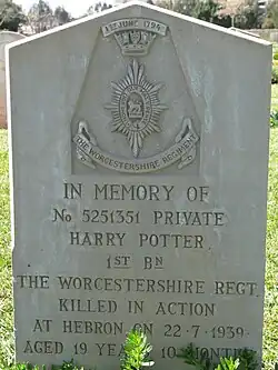 Памяти рядового Гарри Поттера, №5251351, 1-й б-н Вустерширского полка, убитого в бою под Хевроном 22.7.1939, в возрасте 19 лет и 10 месяцев