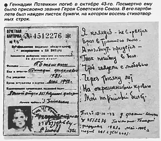 Позднее, вспоминая подвиг Потёмкина и его моральное воздействие на воинов, бывший парторг полка И. В. Асташин писал мне: «Стихотворение-клятву командира батальона капитана Г. Ф. Потёмкина после его гибели я переписал, вложил в свой партийный билет и носил его до окончания войны. Считал его клятву и своей клятвой».