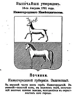 16 августа 1781 года был утверждён герб города Починки: в верхней части щита — Нижегородский герб, в нижней — золотой конь в зелёном поле[4].