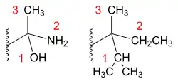- Атом с большим атомным номером старше атома с меньшим атомным номером. Сравнение заместителей проводят по атому, который непосредственно связан со стереоцентром или двойной связью. Чем выше атомный номер этого атома, тем заместитель старше. Если первый атом у заместителей одинаков, сравнение проводят по атомам, удалённым от стереоцентра (двойной связи) на расстояние двух связей (т. н. атомам второго слоя). Для этого эти атомы для каждого заместителя выписывают в виде списка в порядке уменьшения атомного номера и сравнивают эти списки построчно. Старшим считается тот заместитель, в пользу которого будет первое различие. Если старшинство заместителей не удаётся определить по атомам второго слоя, сравнение проводят по атомам третьего слоя и т. д. до первого различия.