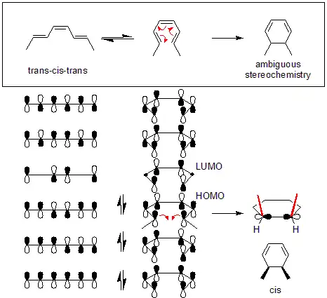 • В нециклических системах, содержащих 4n + 2 электронов, связывающее взаимодействие орбиталей между концами цепи требует перекрывания полуорбиталей, находящихся по одну сторону от плоскости симметрии. Это реализуется в т. н. дисротаторном процессе:
