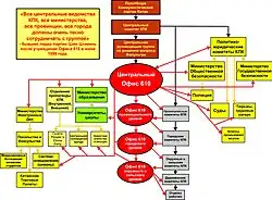 Офис возглавляет высокопоставленный член Политбюро ЦК Коммунистической партии или Постоянного комитета Политбюро. Он тесно связан с Комитетом по политическим и законодательным делам Коммунистической партии Китая[36][уточнить]. Вскоре после создания центрального «Офиса 610» местные отделения были созданы на каждом административном уровне в тех местах, где проживали практикующие Фалуньгун, включая области, районы, города, а иногда и деревни. В некоторых случаях, отделения «Офиса 610» создавались в крупных корпорациях и университетах[36][59]