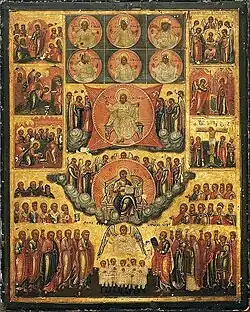 Сопрестолие Изображение Бога Отца в виде седовласого старца (Ветхого денми), Сына в виде мужа, восседающего на троне по правую руку от Него; Святого Духа в виде голубя над троном.