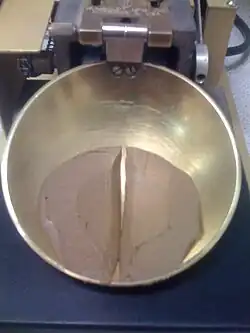 Почва помещается в металлическую чашу (расстояние от низа чаши до основы 1 см.), в её центре делается канавка с помощью стандартного инструмента шириной 2 миллиметра (0,079 ″). Чашка неоднократно падает 10 мм на твердую резиновую основу со скоростью 120 ударов в минуту (поворот ручки 2 поворота в секунду), при этом канавка постепенно смыкается в результате удара. Регистрируется количество ударов, необходимых для закрытия канавки. Влажность, при которой требуется 25 падений, для того чтобы канавка закрылась на расстоянии 12,7 миллиметра (0,50 ″) и есть предел текучести.[5] Метод испытания также позволяет проводить испытание при одном содержании влаги, когда для закрытия канавки требуется от 20 до 30 ударов; затем применяется поправочный коэффициент для получения предела жидкости по содержанию влаги.[6]