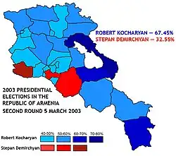 Президентские выборы в Армении 2003 года состоялись в Армении 19 февраля и 5 марта 2003 года. Ни один кандидат не получил большинства голосов в первом туре выборов, второй раунд прошел и Кочарян победил Степана Демирчян с более 67 % голосов. Однако и оппозиция, и международные наблюдатели заявили, что на выборах были замечены фальсификации выборов и оппозиция не признала результаты выборов.