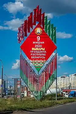 Выборы президента Республики Беларусь 2020 года (бел. Выбары прэзідэнта Рэспублікі Беларусь 2020 года) — шестые очередные выборы белорусского президента, состоявшиеся 9 августа 2020 года[3]. Александр Лукашенко баллотировался в шестой раз и, по официальным данным, одержал победу в первом туре[4]. Согласно ОБСЕ, имеются неоспоримые доказательства фальсификации выборов, а силовые органы применили массовые нарушения прав человека, в том числе пытки, в ответ на мирные демонстрации[5].
