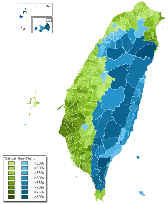 ![]() Карта распределения голосов по регионам: Цай Инвэнь/Уильям Лай Хань Гоюй/Чжан Шаньчжэн | |||