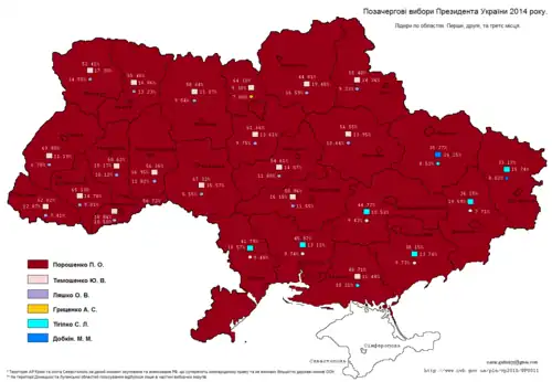 Президентские выборы 2014 года на Украине — шестые (внеочередные) выборы президента Украины; состоялись 25 мая 2014 года. Победу одержал Пётр Порошенко.