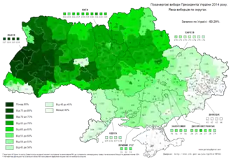 Наиболее высокая явка наблюдалась в западных и центральных областях Украины (без восьми юго-восточных областей), где она составила 67,15 %. Самой низкой стала явка жителей шести юго-восточных (без Донецкой и Луганской) областей Украины — 50,72 %. В Донецкой и Луганской областях голосование было ограничено в связи с позицией руководства самопровозглашённых Донецкой Народной Республики и Луганской Народной Республики[15] и идущего с апреля 2014 года вооружённого конфликта на территории этих областей.